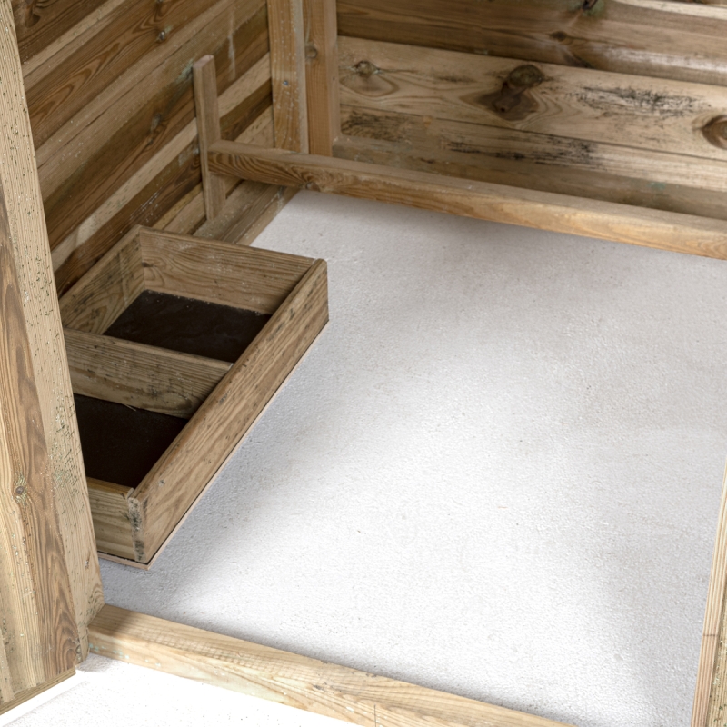 Hooiberg kippenhok Eline XL is één van de grootste kippenhokken uit onze collectie. Dit kippenhok met enorme scharrelruimte heeft een totale (buiten) afmeting van (l) 437 x (b) 150 x (h) 225 centimeter en heeft de looks van een hooischuur. Dit geeft het kippenhok een speelse en strakke, stijlvolle uitstraling in de achtertuin. Het luxe kippenverblijf wordt handgemaakt van hoogwaardige onderhoudsvrije materialen. Zo bestaat het hooiberg nachthok uit een stevig houten frame van geïmpregneerd balken welke een stevige basis biedt voor het robuuste dak van de hooiberg. Het kippennachthok heeft een afmeting van 125 x 125 centimeter en is voorzien van een legnest voor de eitjes en een zitstok voor de nacht. Aan de voorzijde van de hooiberg bevindt zich een deur welke goede toegang biedt tot het volledige nachthok. Voor een goede afwatering en bescherming op koudere winterdagen is het nachthok afgewerkt met rabatdelen en het dak bedekt met stevig zwart dakleer. Via een vrije doorgang kunnen uw kippen zo de kippenren in lopen. Deze ruime scharrelruimte is opgebouwd uit een frame van geïmpregneerde balken en een gaasafwerking voor zowel de wanden als het dak. De kippenren is voorzien van een grote deur welke via de buitenzijde te bereiken is. Dit ruime kippenhok met grote ren biedt een veilig en comfortabel nachtverblijf aan uw kippen én voldoende ruimte om lekker te kunnen scharrelen.
