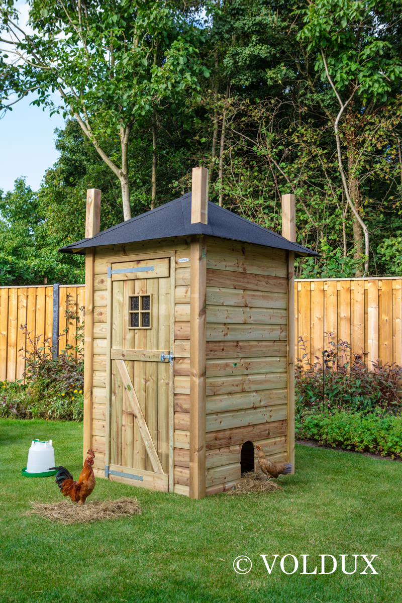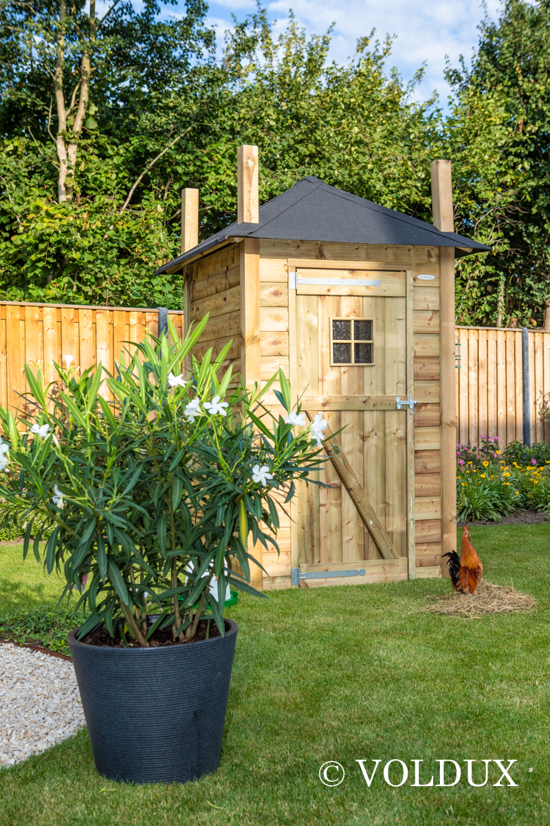 Deze prachtige blikvanger hooiberg Eline is een aanwinst voor uw kippen. De hooiberg voor kippen heeft een (buiten) afmeting van (l) 150 x (b) 150 x (h) 225 centimeter en is gemaakt van geïmpregneerd hout. Dit zorgt ervoor dat dit kippenverblijf onderhoudsarm is en een levensduur biedt van wel 10 tot 15 jaar! Het kippenhok Eline bestaat uit een stevige constructie van geïmpregneerd houten balken en is voorzien van een strakke afwerking met rabatdelen. In het verblijf bevinden zich een zitstok voor de nacht én natuurlijk een ruim legnest voor uw hennen. Het nachthok beschikt over een vrije doorgang voor de kippen en een grote toegangsdeur aan de voorzijde. Dit maakt het mogelijk eenvoudig zelf het hok te betreden voor het rapen van eitjes of de schoonmaak. Het Voldux kippenhok heeft de uitstraling van een hooiberg waardoor hij perfect tot zijn recht komt in een ruime kippenren!