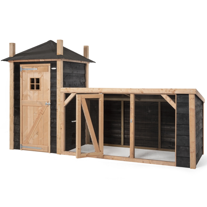 Het kippenhok Gijs is een hooiberg met een prachtige scharrelruimte. Dit luxe kippenhok met grote kippenren heeft een totale afmeting van (l) 392 x (b) 150 x (h) 380 centimeter. Het verblijf voor kippen is volledig handgemaakt uit onderhoudsvrije materialen. Hierdoor biedt het kippenhok een levensduur van 10 tot 15 jaar, zonder jaarlijkse lak of beitsbehandeling. De Hooiberg Gijs bestaat uit twee gedeeltes; één gedeelte hiervan is het nachthok. Dit hoge kippen nachthok heeft een grondoppervlakte van 125 x 125 centimeter en is voorzien van een praktisch legnest en een zitstok voor kippen. Het kippen nachthok is ontworpen met de klassieke details van een hooiberg wat een stijlvolle uitstraling geeft aan het kippenverblijf. Het stevige frame van het kippenhok is gemaakt van geïmpregneerde houten balken welke een robuuste basis geeft aan het geheel. De buitenzijde is verstevigd met Douglas balken welke tevens de dakconstructie ondersteunen. Doordat het verblijf is afgewerkt met zwarte potdeksel delen ontstaat een stijlvol totaalplaatje welke zeker niet zou misstaan in de achtertuin. Via de grote toegangsdeur kunt u het kippenhok eenvoudig zelf betreden. Voor de kippen is er een open doorloop van het nachthok naar de kippenren. De ren biedt een ruimte oppervlakte scharrelruimte voor meerdere kippen. De kippenren is aan twee zijdes gesloten, dit zorgt ervoor dat er minder regen en wind in het verblijf kan komen en de kippen ook op regenachtige dagen droog zitten. Het dak van de kippenren is voorzien van dakleer wat zorgt voor een goede afwatering op het kippenhok. Aan de voorzijde is de ren afgewerkt met sterk gaas voorzien van een deurpaneel, dit geeft optimale toegang tot het gehele verblijf. Dit luxe kippenhok is een aanwinst voor de tuin én een comfortabel, veilig en ruimtelijk verblijf voor uw kippen.