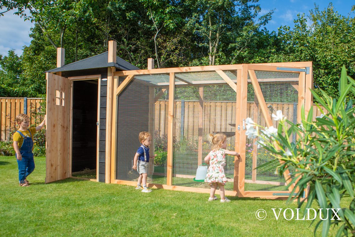 Dit robuuste kippenhok Mees XL voor buiten heeft een stijlvolle kleuren combinatie, is gemaakt van hoogwaardige materialen én biedt een levensduur van 10 tot 15 jaar. Hiernaast is het verblijf onderhoudsvrij door het gebruik van onderhoudsvrije geïmpregneerde materialen welke bestand zijn tegen de verschillende weersinvloeden. Dit grote kippenhok heeft een totale (buiten) afmeting van (l) 437 x (b) 150 x (h) 225 centimeter en biedt enorm veel veilige en comfortabele ruimte aan uw kippen. Dit prachtige kippenhok bestaat uit een groot stevig kippen nachthok én een scharrelgedeelte. Het nachthok van dit verblijf is opgebouwd met geïmpregneerde balken welke een stevige basis bieden. De buitenzijde van het nachthok is voorzien van Douglas balken en is afgewerkt met zwarte potdeksel delen. Deze combinatie van materialen is opvallend stijlvol en geeft een hoogwaardige uitstraling aan het kippenhok. Het robuuste dak is voorzien van zwart dakleer wat zorgt voor een goede bescherming en afwatering. Het nachthok beschikt over een zitstok voor de nacht, een legnest en een grote toegangsdeur waarmee u zelf altijd goede toegang heeft tot het verblijf én uw kippen. Via de open doorgang kunnen uw kippen zo de kippenren in scharrelen. Deze ruime Douglas kippenren is voorzien van stevig gaas op de wanden én het dak. Veel lichtinval maar geen kans op ontsnappen in dit kippenhok dus. De kippenren beschikt tevens over een toegangsdeur waarmee u eenvoudig zelf de kippenren kunt betreden. Dit hoogwaardig én stijlvol kippenhok met grote ren is een aanwinst voor uw kippen én biedt een sfeervolle uitstraling in de achtertuin.